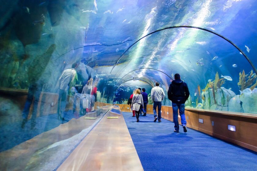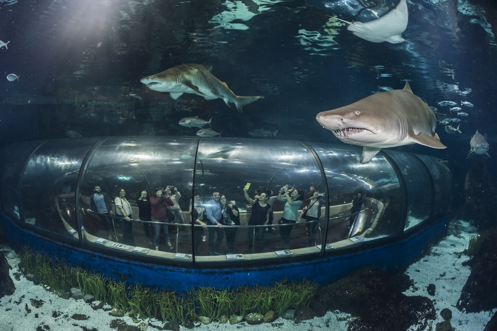 Диаметром в 26 метров и глубиной в 5 метров, он содержит 5000 куб. метров морской воды! Два туннеля, находящихся по его обеим сторонам (один из них – самый большой в мире), позволяют посетителю пройтись на расстоянии нескольких сантиметров от уникальных рыб, среди которых есть и акулы довольно больших размеров.