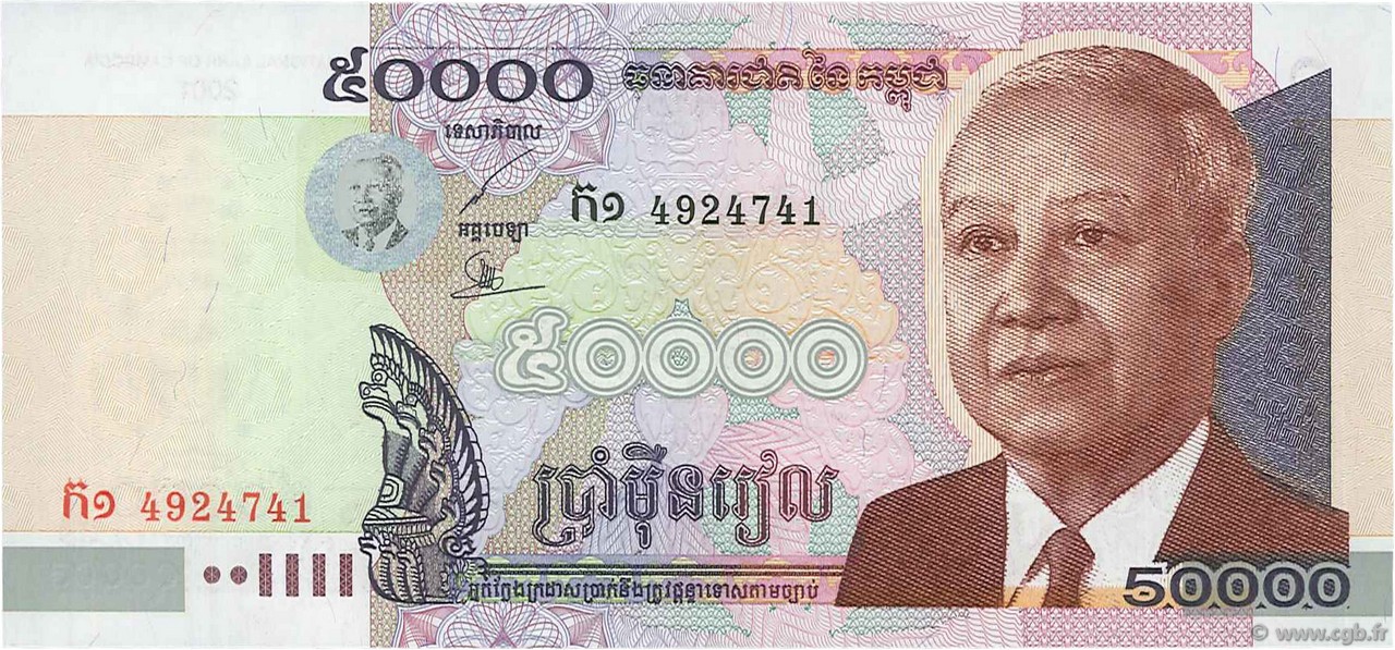 На лицевой стороне банкноты 50000 риелей изображен экс-король Нородом Сианук в пожилом возрасте и голова змея-Нага.