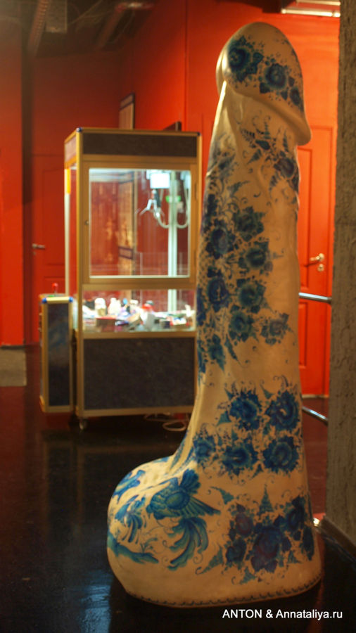 Двухметровый пластиковый фаллос, расписанный под гжель, в своей очумелости может конкурировать с бронзовым изваянием в стиле «фэнтези», где обнаженная перепончатая девица с крыльями восседает на плече у псевдоголливудского монстра. При взгляде же на старинную коллекцию артефактов, подразумевающих мужское достоинство, на ум приходит набор исключений из учебника русского языка — «стеклянный, оловянный, деревянный». Дореволюционные брошюры «Женские болезни» и «Гигиена пола», как и советские презервативы в бумажной упаковке, вне комментариев.