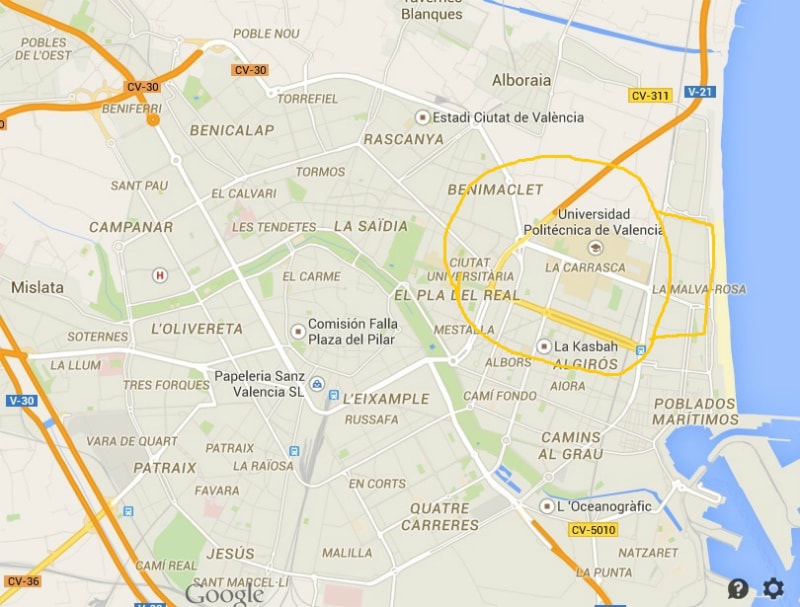 - Очень хорошую недвижимость в районе Camins al Grau можно найти рядом с сухим руслом реки Турия в квартале Penya Roja. Самая дорогая зона – Paseo Alameda, расположенная прямо у сухого русла реки. Окна многих квартир здесь выходят на парки, расположенные в сухом русле. Чуть дальше расположены варианты попроще (но тоже очень неплохие) по более низким ценам.