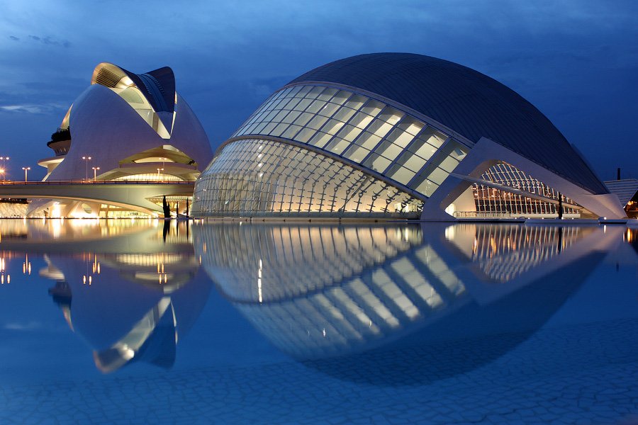 20. Слева — L’Hemisfèric — кинотеатр IMAX, планетарий и театр лазерных постановок. Справа — Дворец искусств имени королевы Софии (L’Hemisfèric El Palau de les Arts Reina Sofía).