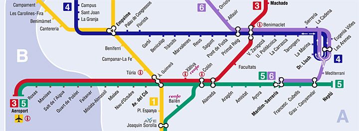 Метро Валенсии включает четыре зоны и тесно связано с сетью трамваев. Всего насчитывается 7 линий: L1, L3, L5 относятся к метро, L4 и L6 – к трамвайным линиям.