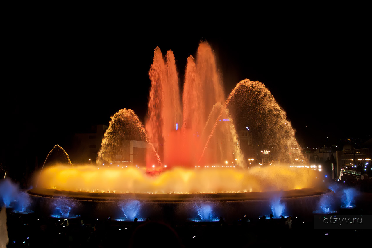 Собственно, фонтанов у подножия горы Монжуик много, но волшебный, танцующий и поющий, только один, окруженный овальным бассейном. Водные струи, подсвеченные лампочками,» танцуют» в такт музыке: поднимаются и опадают, сплетаются, устало сникают и тут же энергично распрямляются… 4 730 ламп десяти цветов создают 50 цветовых оттенков. Музыка звучит самая разнообразная: симфоническая, опера и оперетта, популярные мелодии 80-х и 90-х годов, саундтреки к кинофильмам, испанская фольклорная музыка. В общем, от Бетховена до «Властелина колец» и «Крестного отца». Цвет, звук, форма водяных струй – все меняется синхронно, создавая особый вид искусства, «водную светомузыку». Как это делается? Пишут, что до недавнего времени фонтан управлялся вручную, теперь же шоу программируется автоматически.