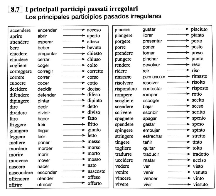Помните, что причастие прошедшего времени образуется путем удаления окончания глагола (-ar, -er или -ir) и добавления -ado или 9.0007 -идо. Глаголы -Ar предполагают -ado в качестве своего нового окончания, а глаголы -er и -ir принимают -ido в качестве окончания.