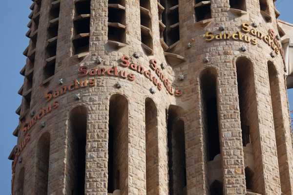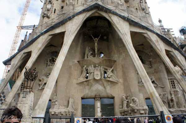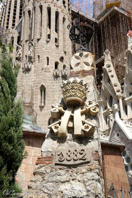 Виноград на небольших башнях слева от строящегося фасада символизирует Святое причастие. В декоре храма Святого Семейства вообще очень много всякой символики, можно увидеть даже нумерологию.