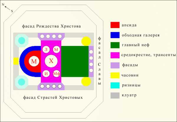 На иллюстрации показано взаимное положение основных элементов храма Святого Семейства. Эта пятинефная церковь спланирована в формелатинского креста, образованного пересечением главного нефа с трехнефным трансептом. Необычайно большая по размеру апсида, под которой расположена крипта, включает семь часовен и обходную галерею за хором. Окружающий здание клуатр должен будет соединить все фасады церкви: южный фасад Страстей Христовых, восточный фасад Славы и северный фасад Рождества Христова. Сооружение будет увенчано восемнадцатью башнями.